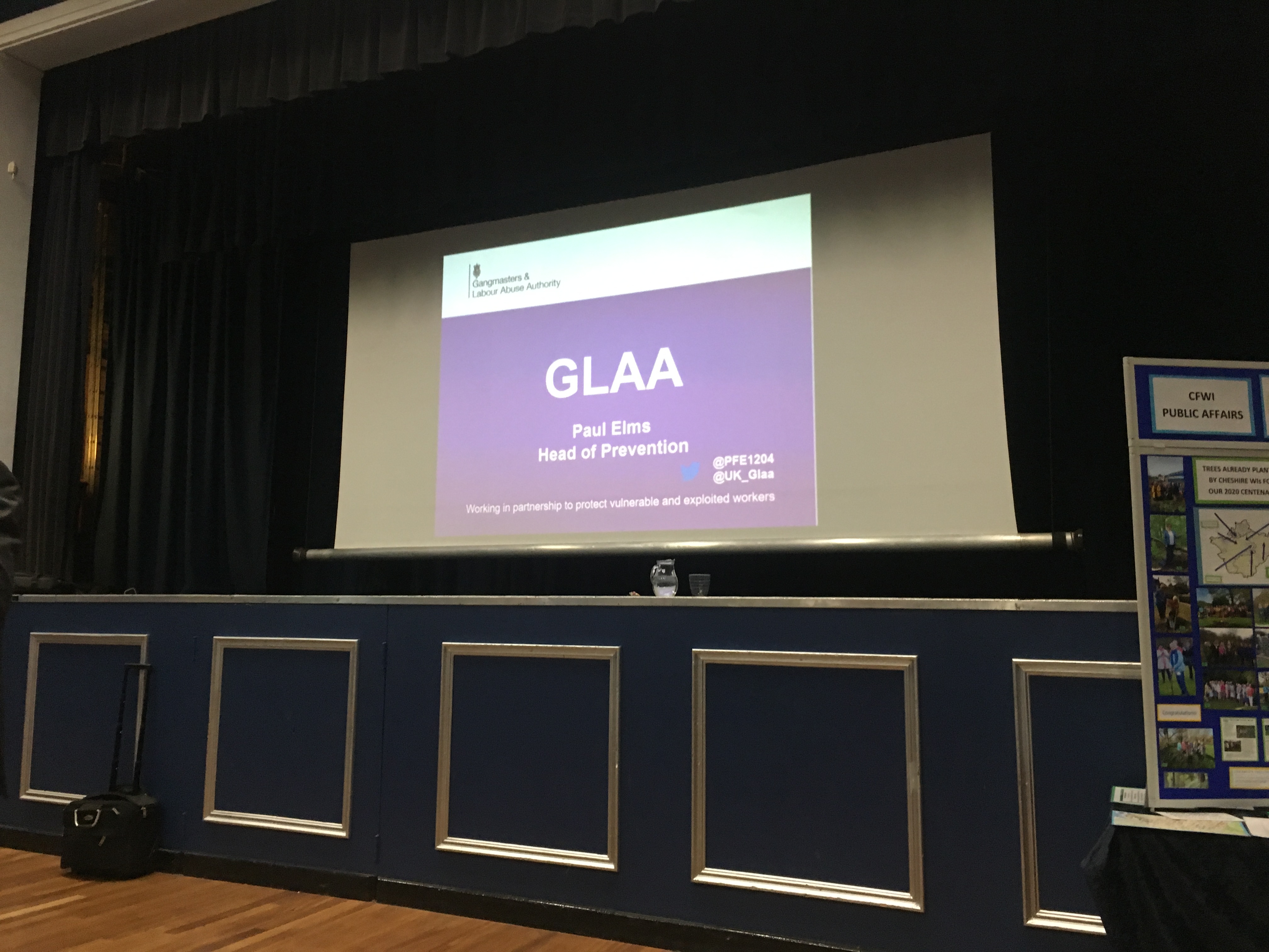 On a bright sunny morning almost 200 PALS and WI members descended on Frodsham Community Centre to listen to Gary Spratt and his colleague Paul Miller from Libre Solutions and Paul Elms from, Gangmasters & Labour Abuse Authority (GLAA), speaking and enlightening us all on aspects of Modern Day Slavery. Prior to the Abolition Vote in 1789, William Wilberforce stated “You may choose to look the other way, but you can never say again that you do not know”. This statement is revalent today as we heard harrowing accounts of slavery and people trafficking, from the Morecambe Bay cockling disaster, where 21 were known to have lost their lives, to the modern day Nail Bars and Car washes.