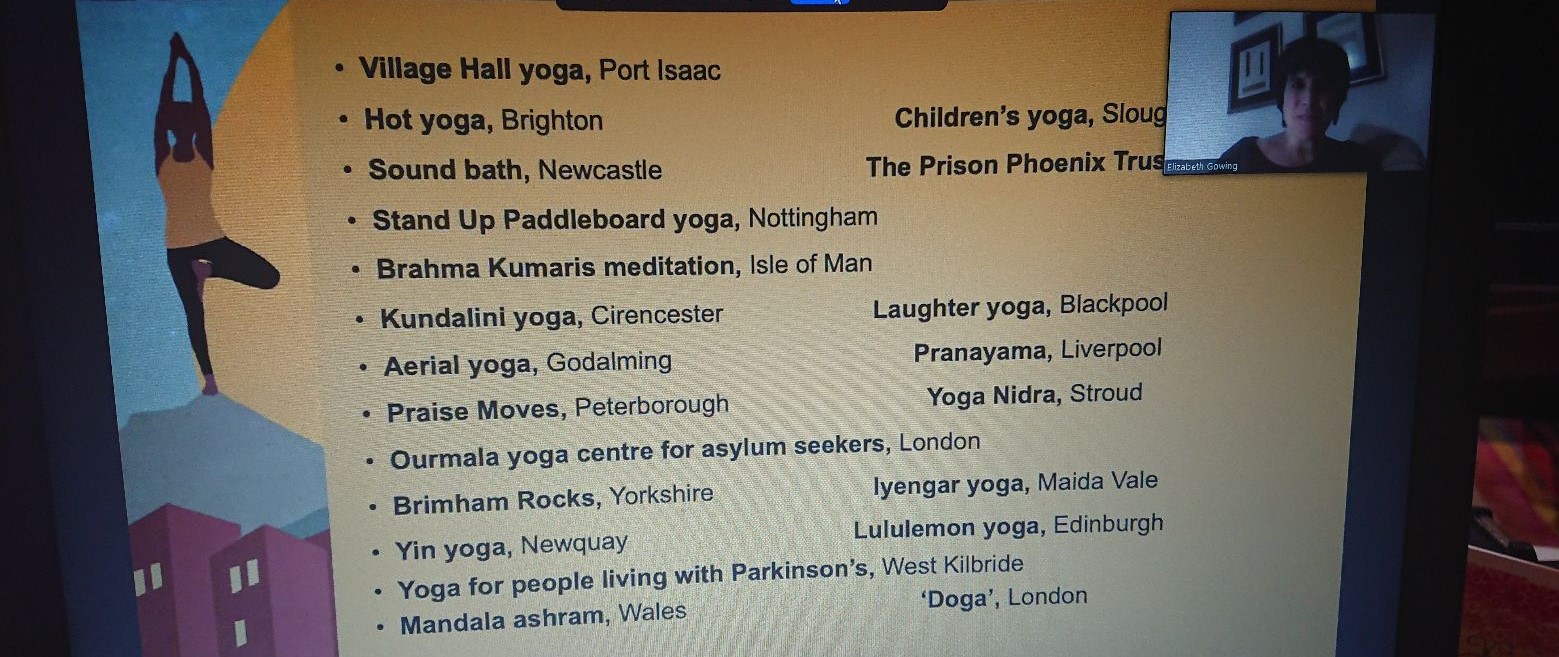 Elizabeth explained that she was not a likely yogini; too fond of chocolate and To-do lists, and sometimes falls over on her mat. So, this was not a ‘how to’ talk – it’s was given by an explorer rather than an expert.