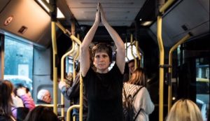 Elizabeth explained how she had travelled around Britain sampling various types of yoga. Sometimes funny, sometimes touching, but it evoked the characters and communities met along a fascinating journey. She practiced doga (yes, yoga with your dog) with Crikey the Cockerpoo in London, spent a dripping day of ‘hot yoga’ in Brighton, hung upside down in aerial yoga in Godalming, to yoga in prisons with The Phoenix Prison Trust – one prisoner said yoga had saved his life and even yoga on a Chiltern Train during their Mindfulness May for their commuters.